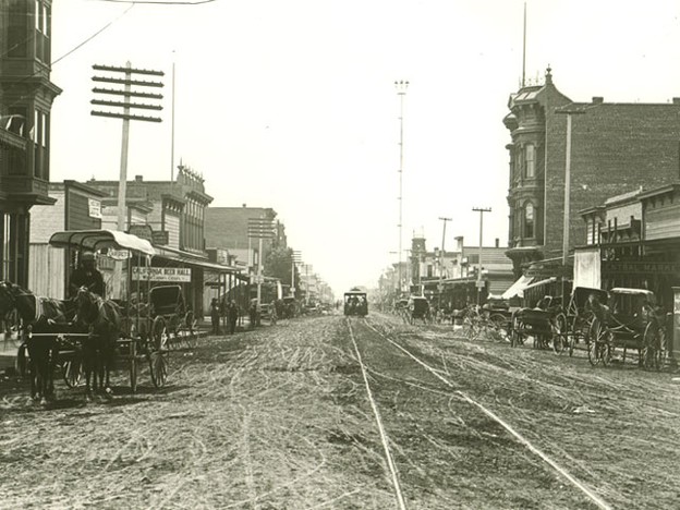 Fifth Street, San Diego. Note tracks and California Beer Hall